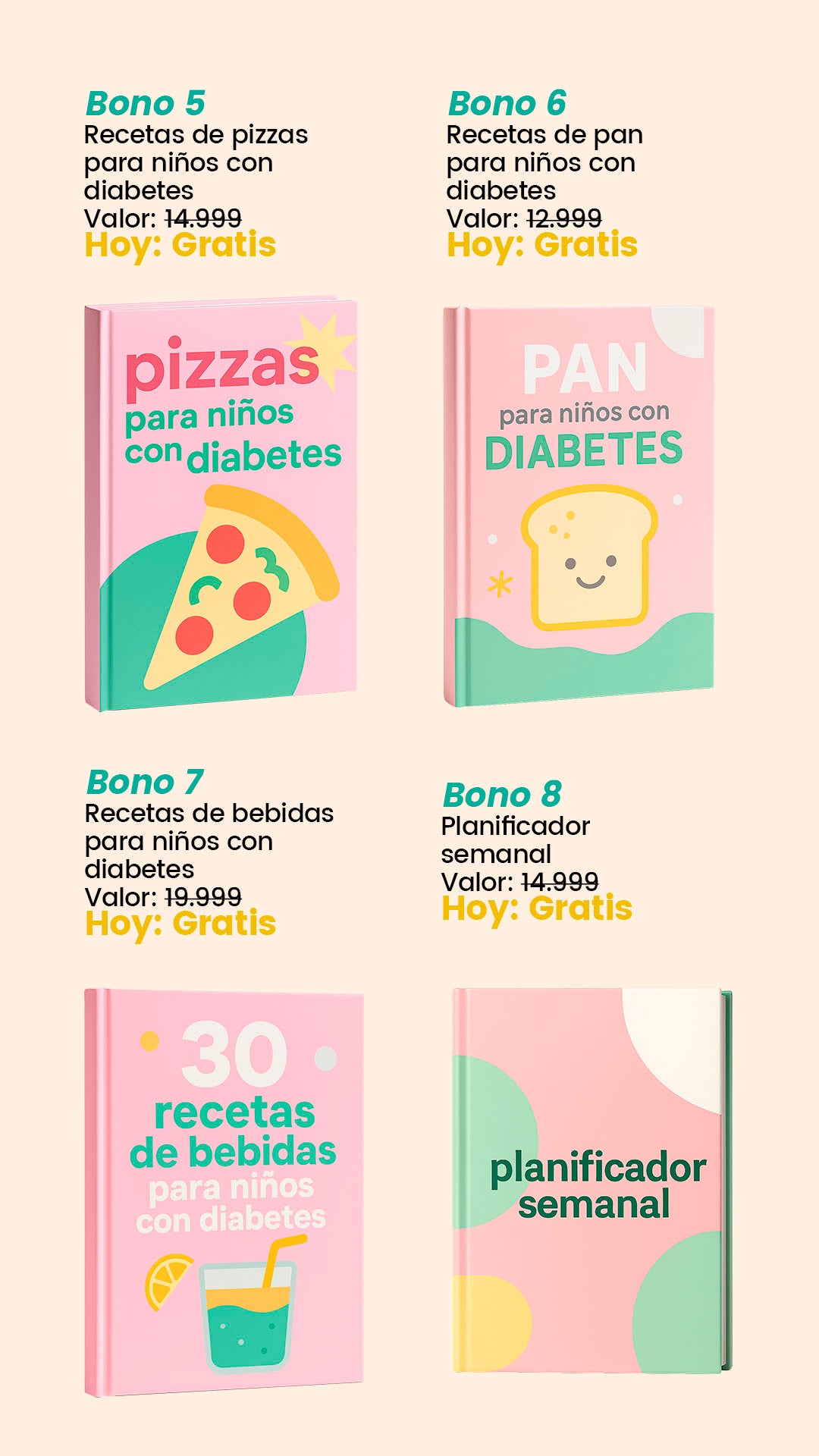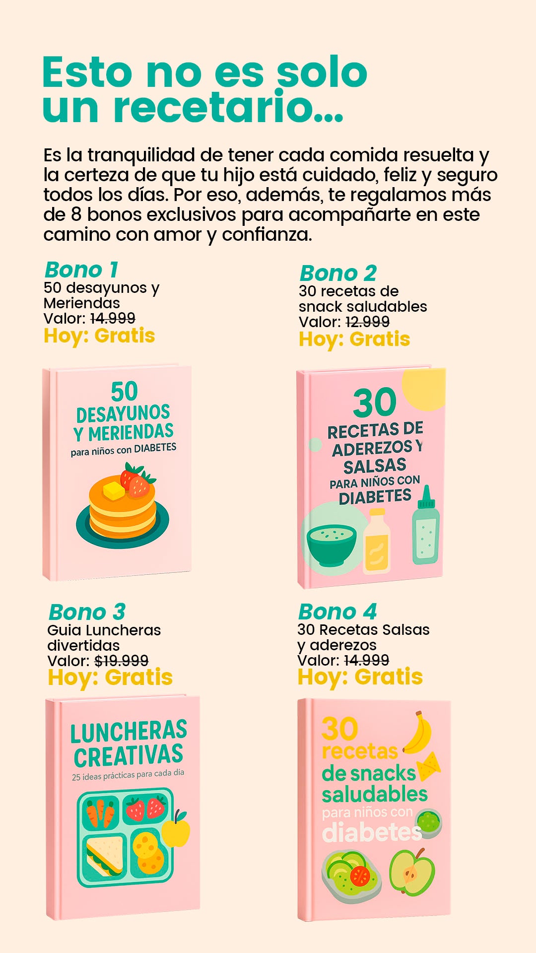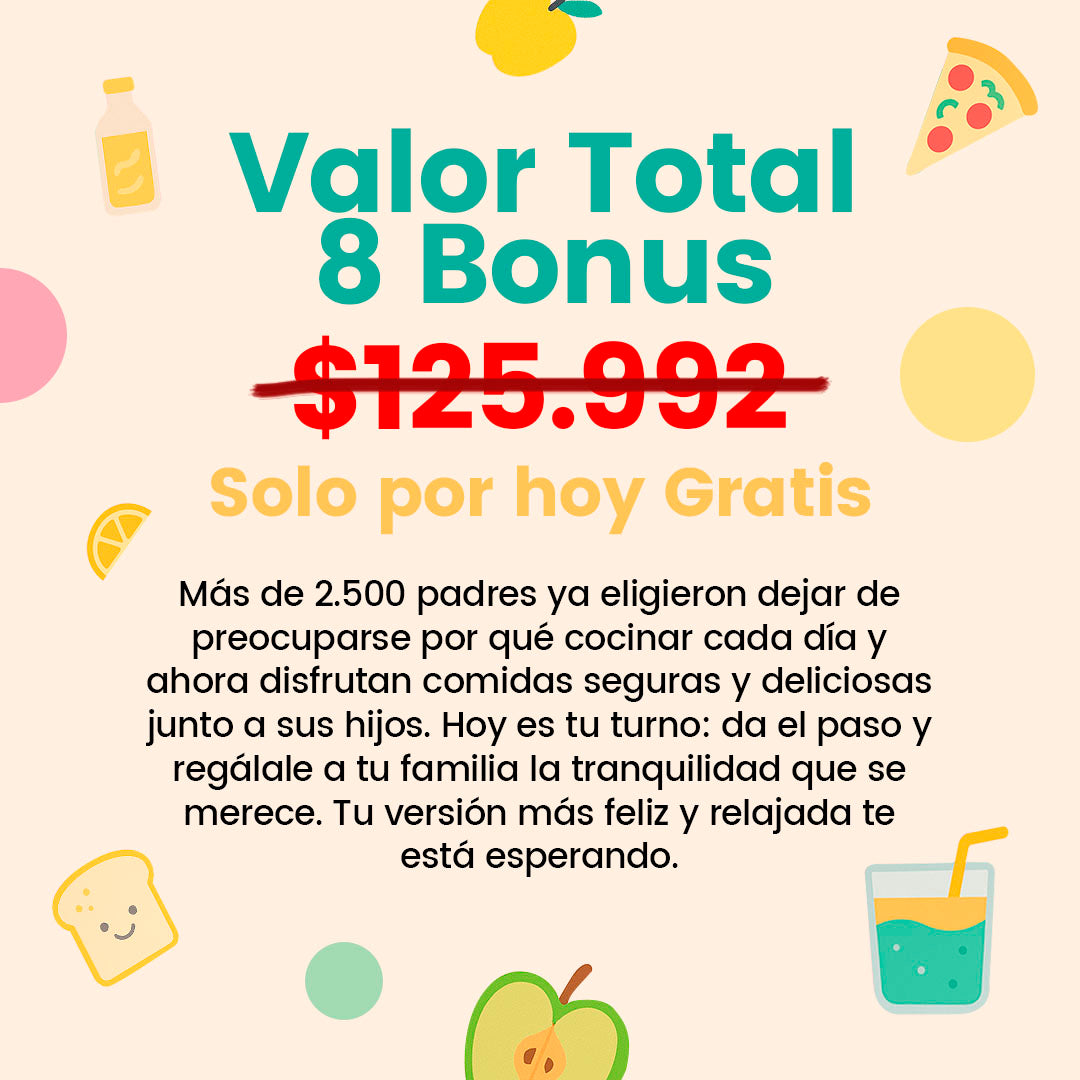 Incluye porciones sugeridas, alternativas de ingredientes y tips de preparación. Además, los bonos complementan con opciones prácticas para que siempre tengas variedad, sin aburrir a tu hijo ni complicarte con cálculos difíciles.